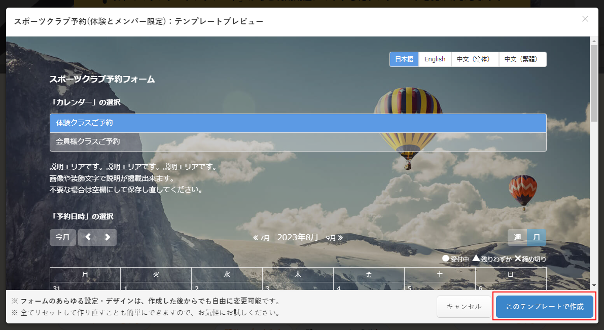 「テンプレートプレビュー」で予約フォームを確認することができます。