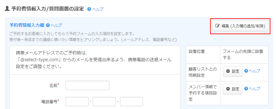 予約者情報入力欄の設定の「編集」ボタンをクリックします。