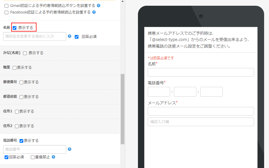 <予約者情報入力欄の設定>