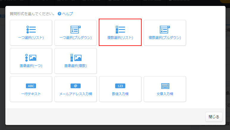 選択項目を複数選べるように質問形式を「複数選択(リスト)」で作成していきます。