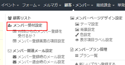 上部メニュー「顧客・メンバー」⇒「メンバー受付設定」をクリックします。