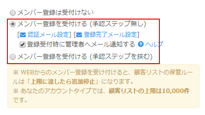 WEBでのメンバー受付設定にて「受付ける」を指定します