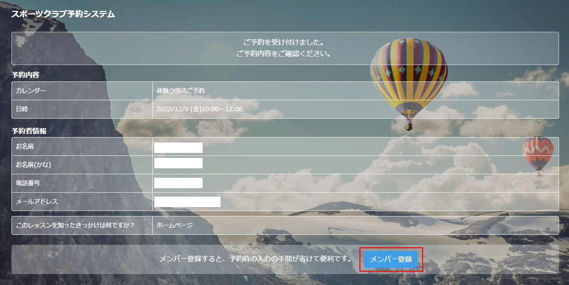 予約フォームに「メンバー登録」ボタンが表示されます