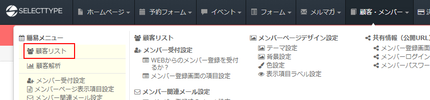 上部メニュー「顧客・メンバー」⇒「顧客リスト」をクリックします