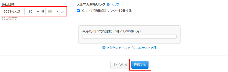 最後に送信する日時を決めて、「送信する」ボタンをクリックしましょう。