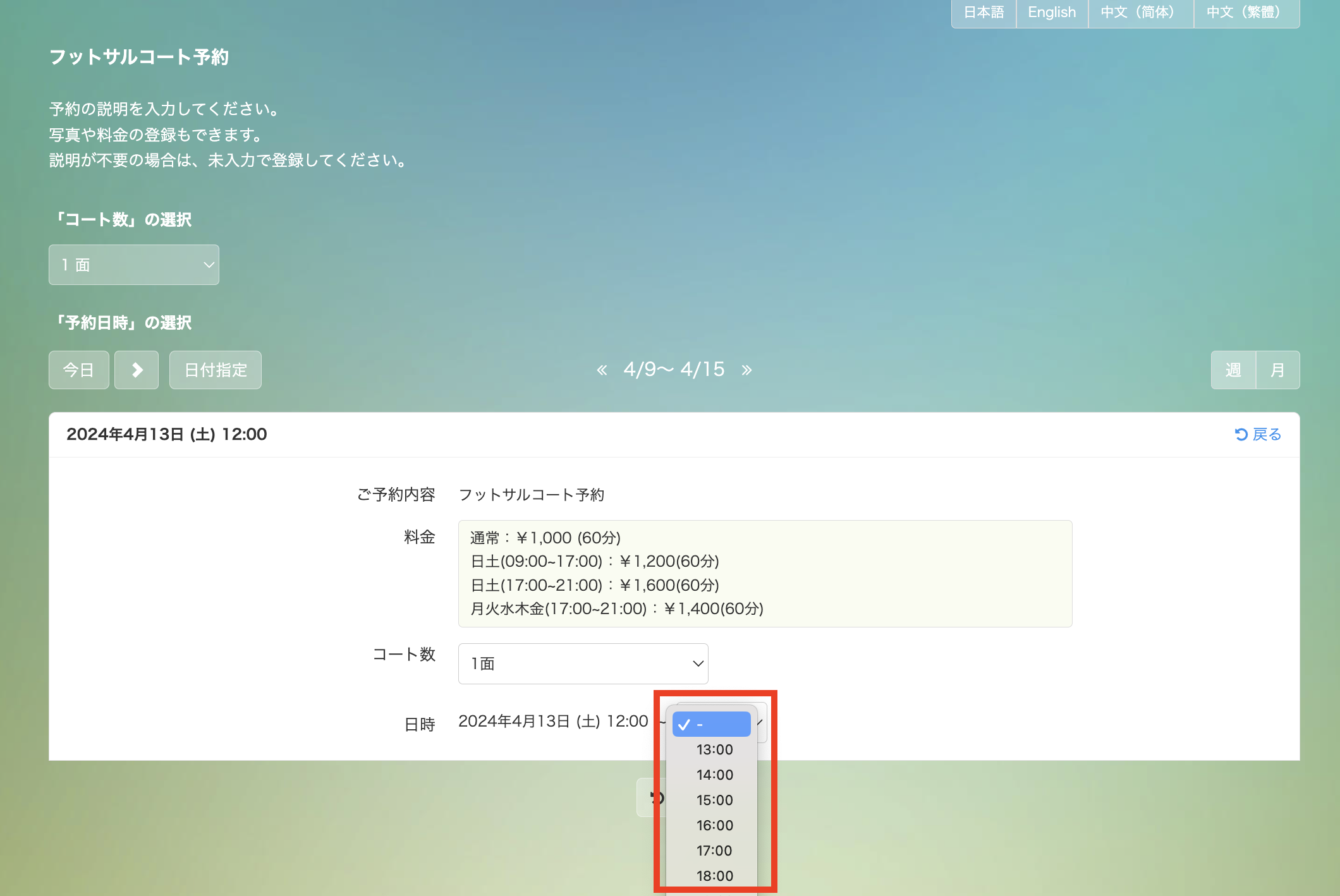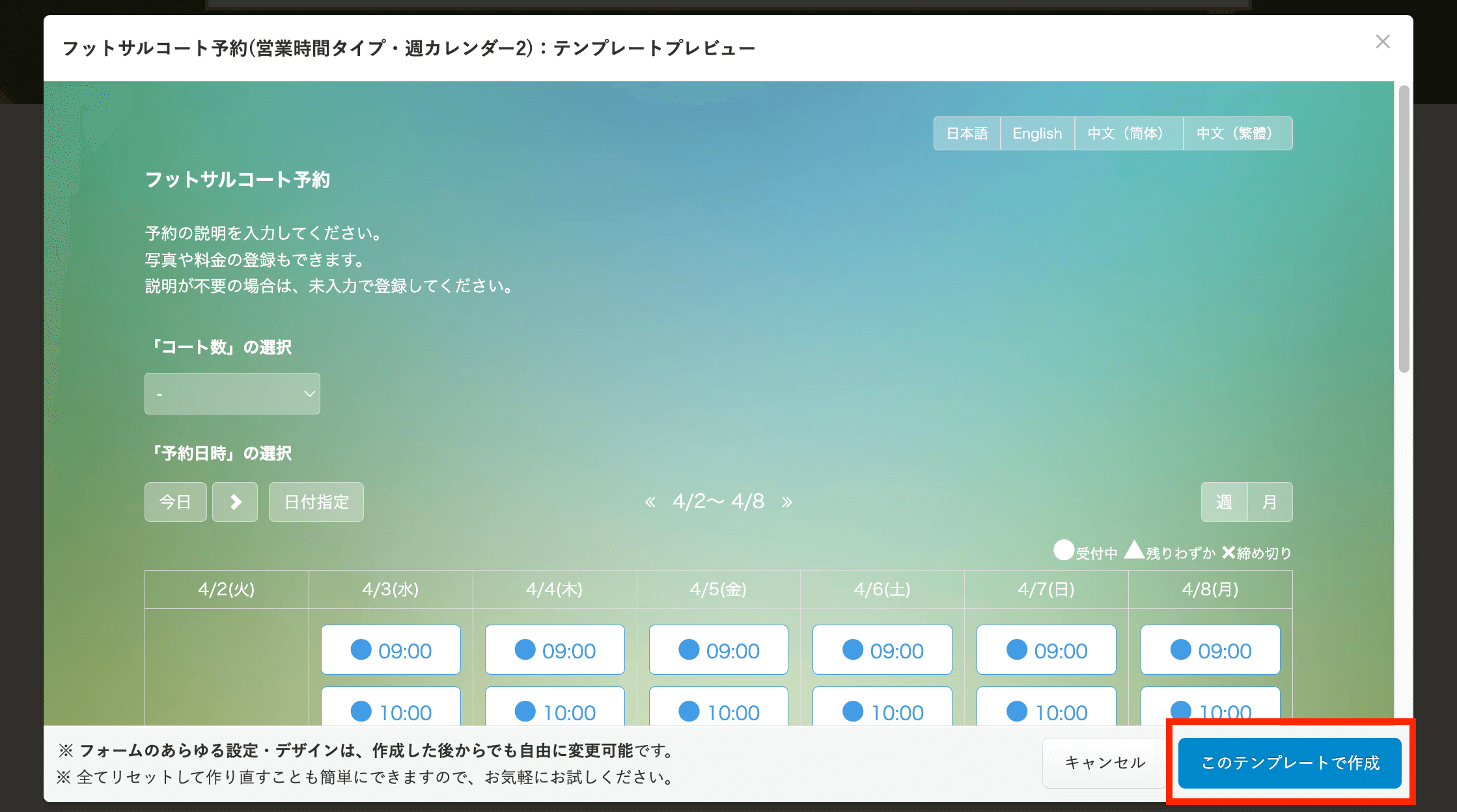 SelectTypeではフットサルコートの予約受付を想定した以下のサンプルテンプレートをご用意しています。