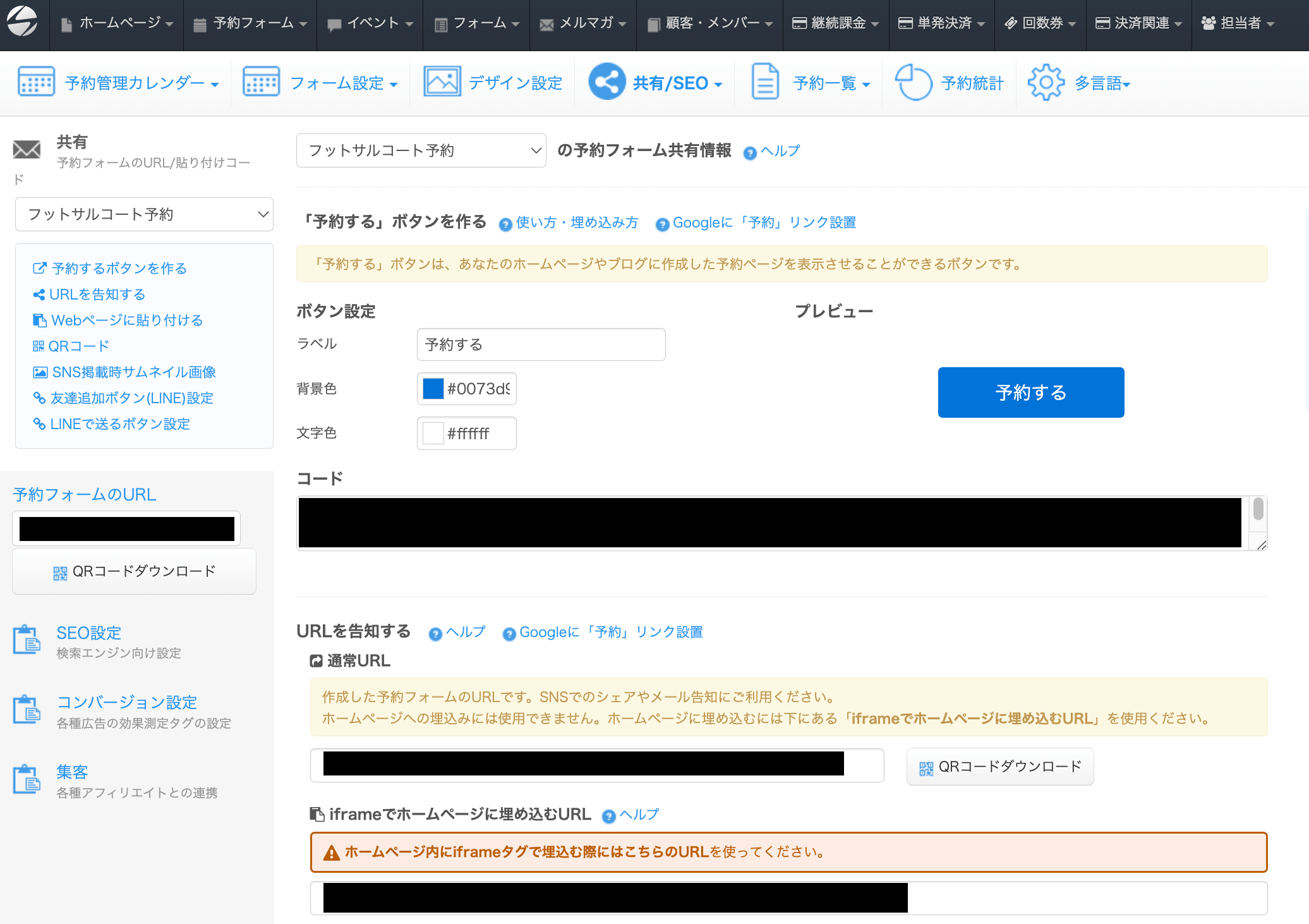 予約フォームのURL、ホームページに設置するリンクボタン、ホームページ埋め込みタグなどの情報が表示されます。