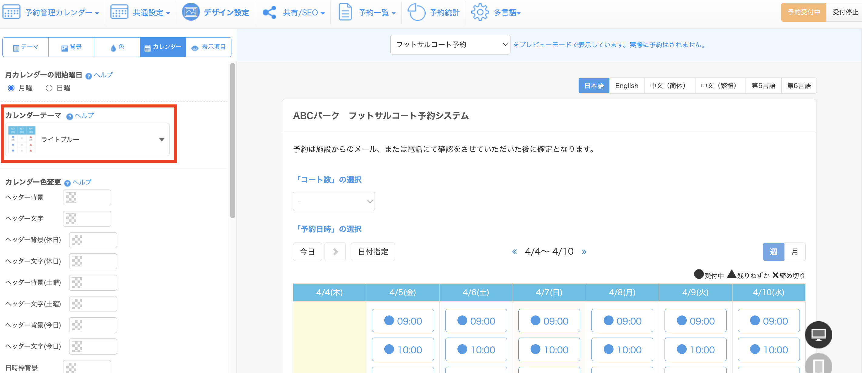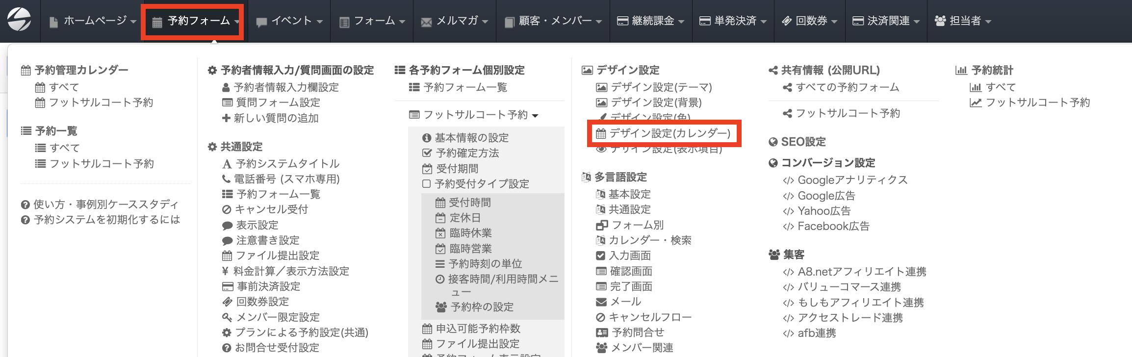 ヘッダーの「予約フォーム」をクリックすると表示される「デザイン設定(カレンダー)」をクリックすると、設定画面が表示されます。