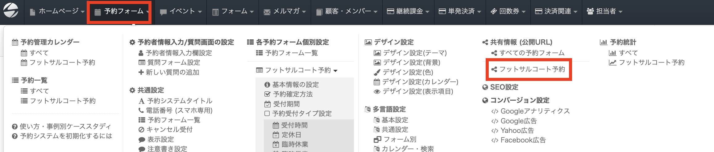 予約システムのURLなどの共有情報を確認するには、ヘッダーの「予約フォーム」をクリックし、共有情報(公開URL)欄の「フットサルコート予約」をクリックします。