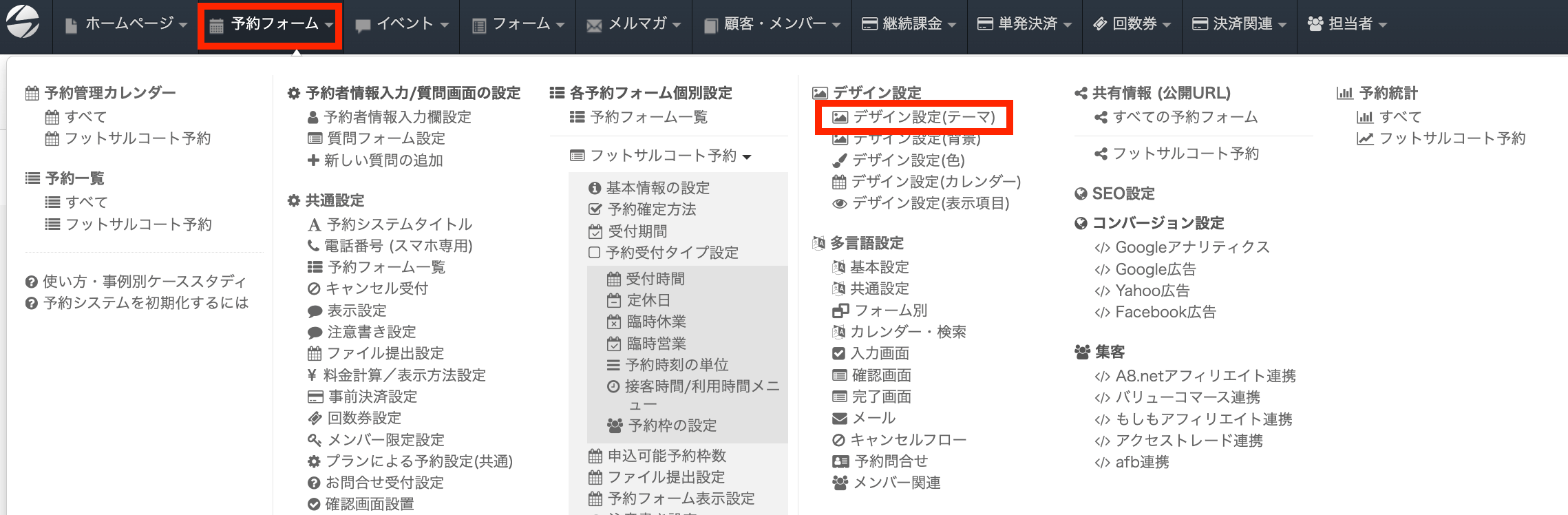 ヘッダーの「予約フォーム」をクリックし「デザイン設定(テーマ)」をクリックすると設定画面が表示されます。