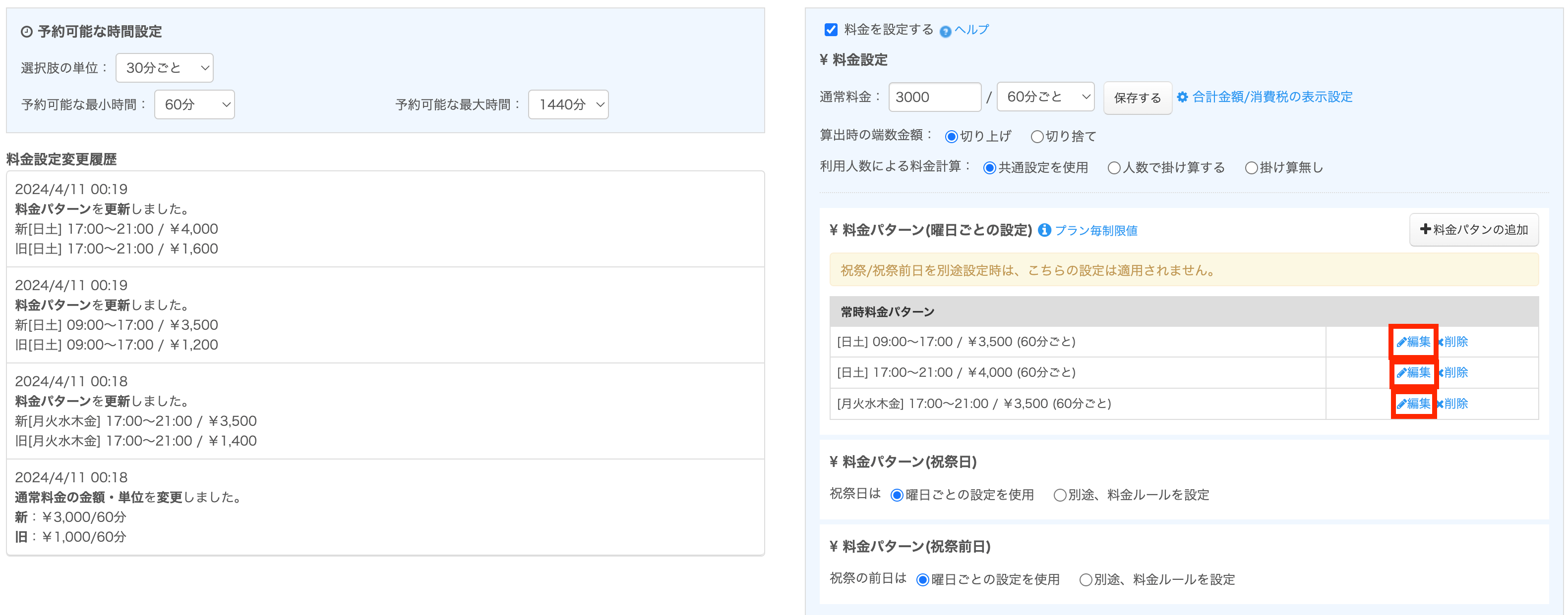 料金設定欄で、曜日ごと、時間帯ごとに異なる料金を設定することができます。