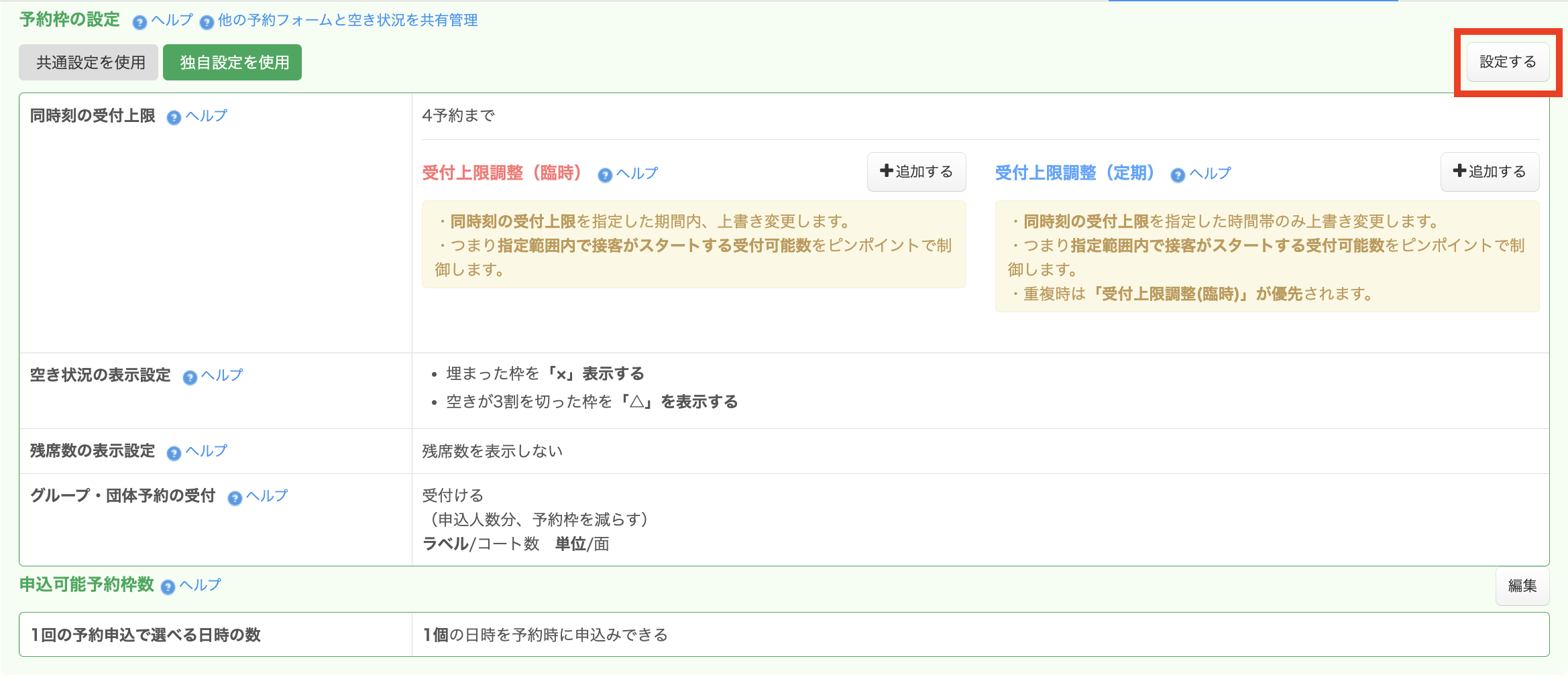 予約枠の設定欄の「設定する」をクリックすると、設定画面が表示されます。