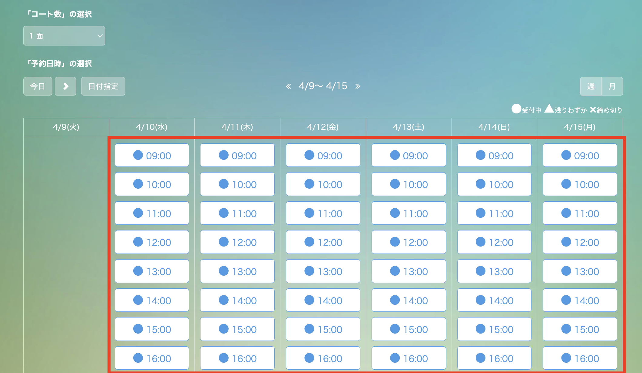 予約時刻の単位を60分区切りに設定した場合、以下のように時間帯が表示されます。