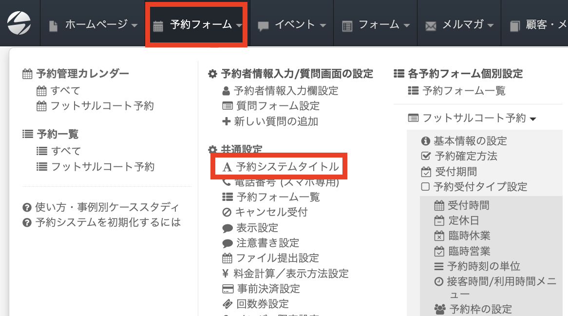 ヘッダーの「予約フォーム」をクリックすると表示される「予約システムタイトル」をクリックすると、予約システムのタイトル設定画面が表示されます。