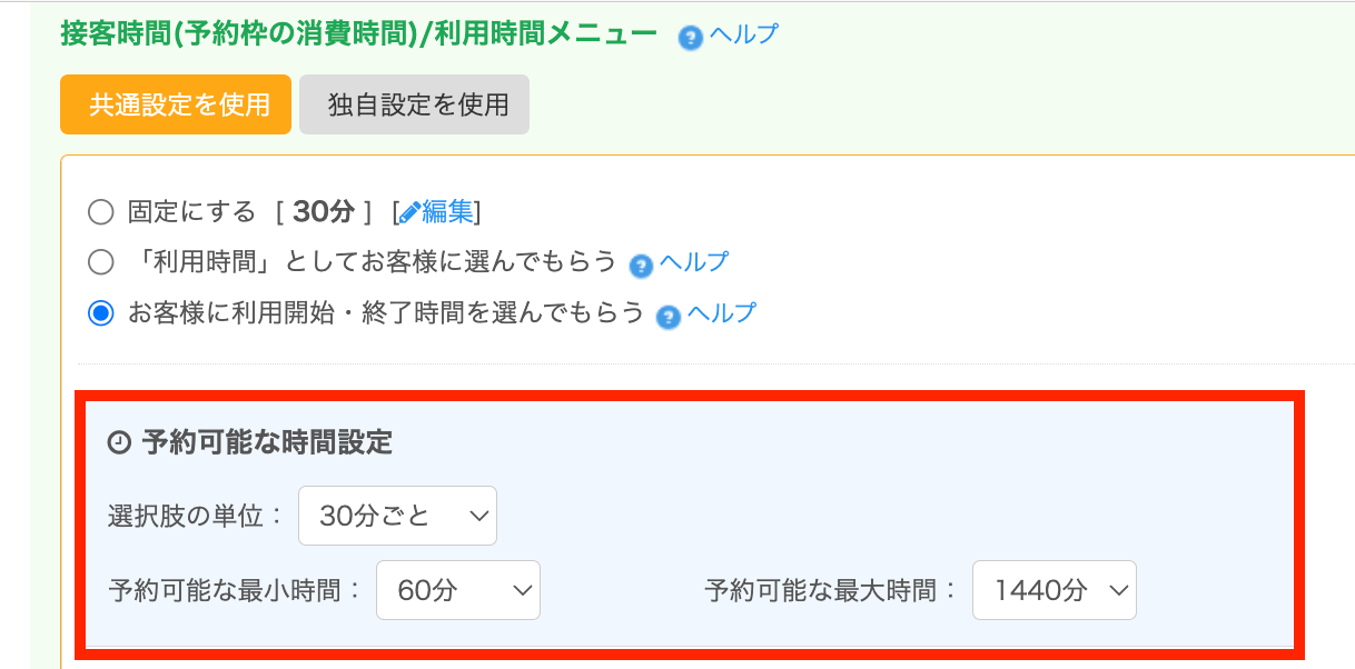 「予約可能な時間設定」欄で設定が可能です。予約時間の単位、予約可能な最小時間、予約可能な最大時間を設定できます。