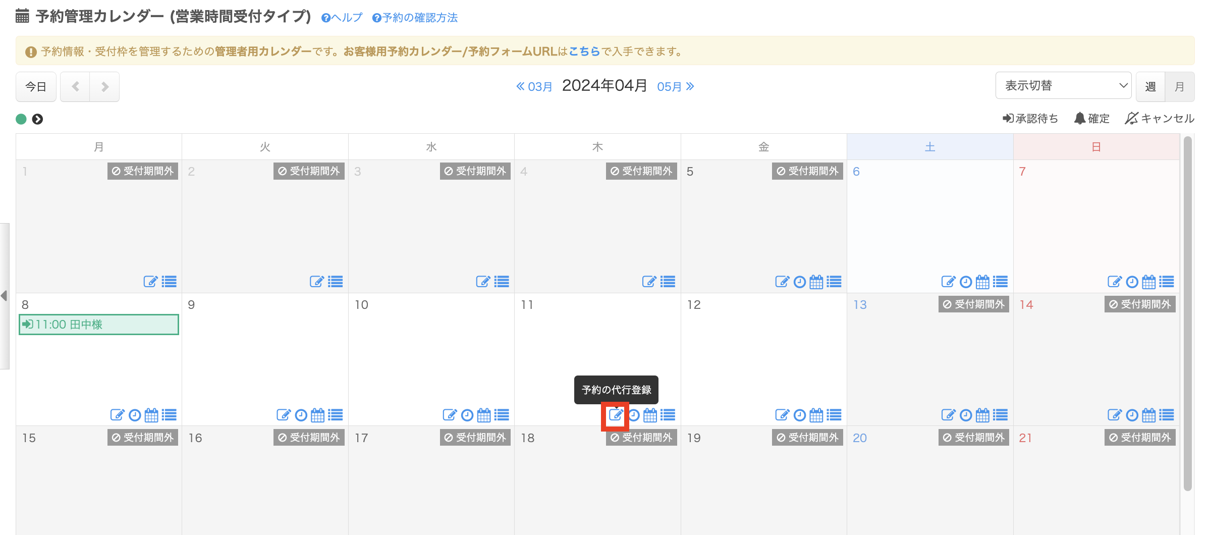 以下の赤枠で囲ったアイコンをクリックし、予約の代行登録を行います。