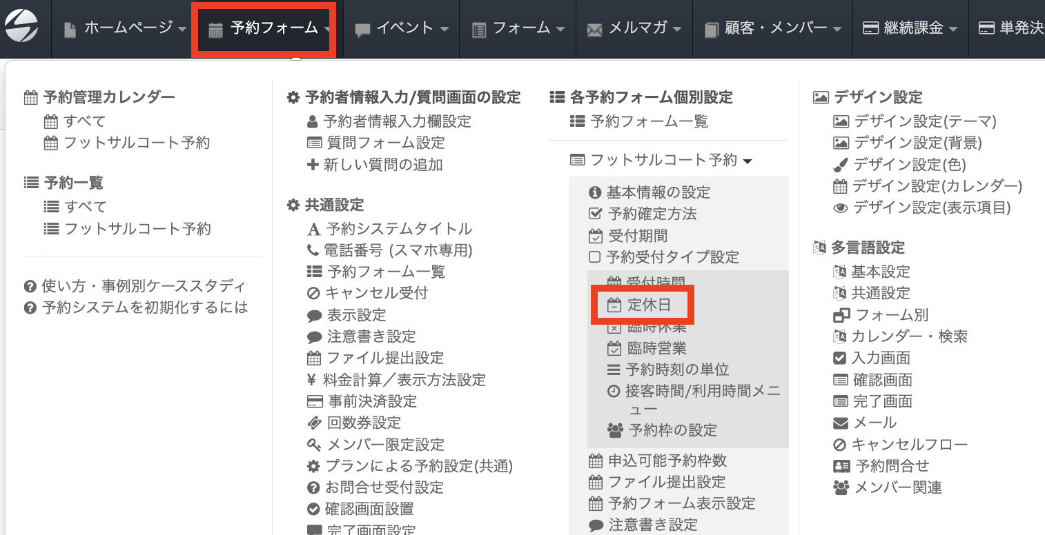 定休日を設定するには、ヘッダーの「予約フォーム」をクリックすると表示される「定休日」をクリックします。