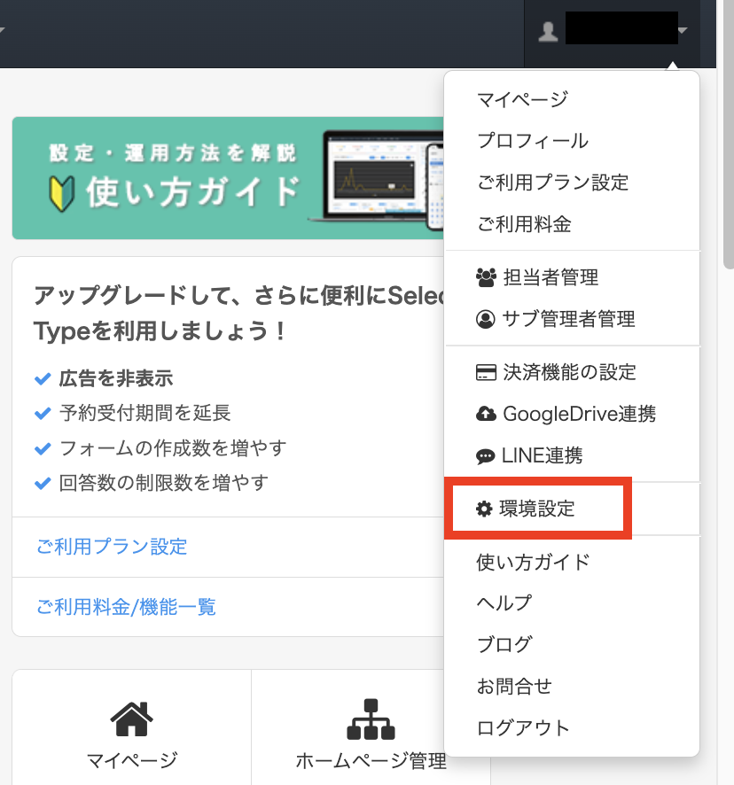 ヘッダー右端のメニューをクリックすると表示される「環境設定」をクリックすると、設定画面が表示されます。