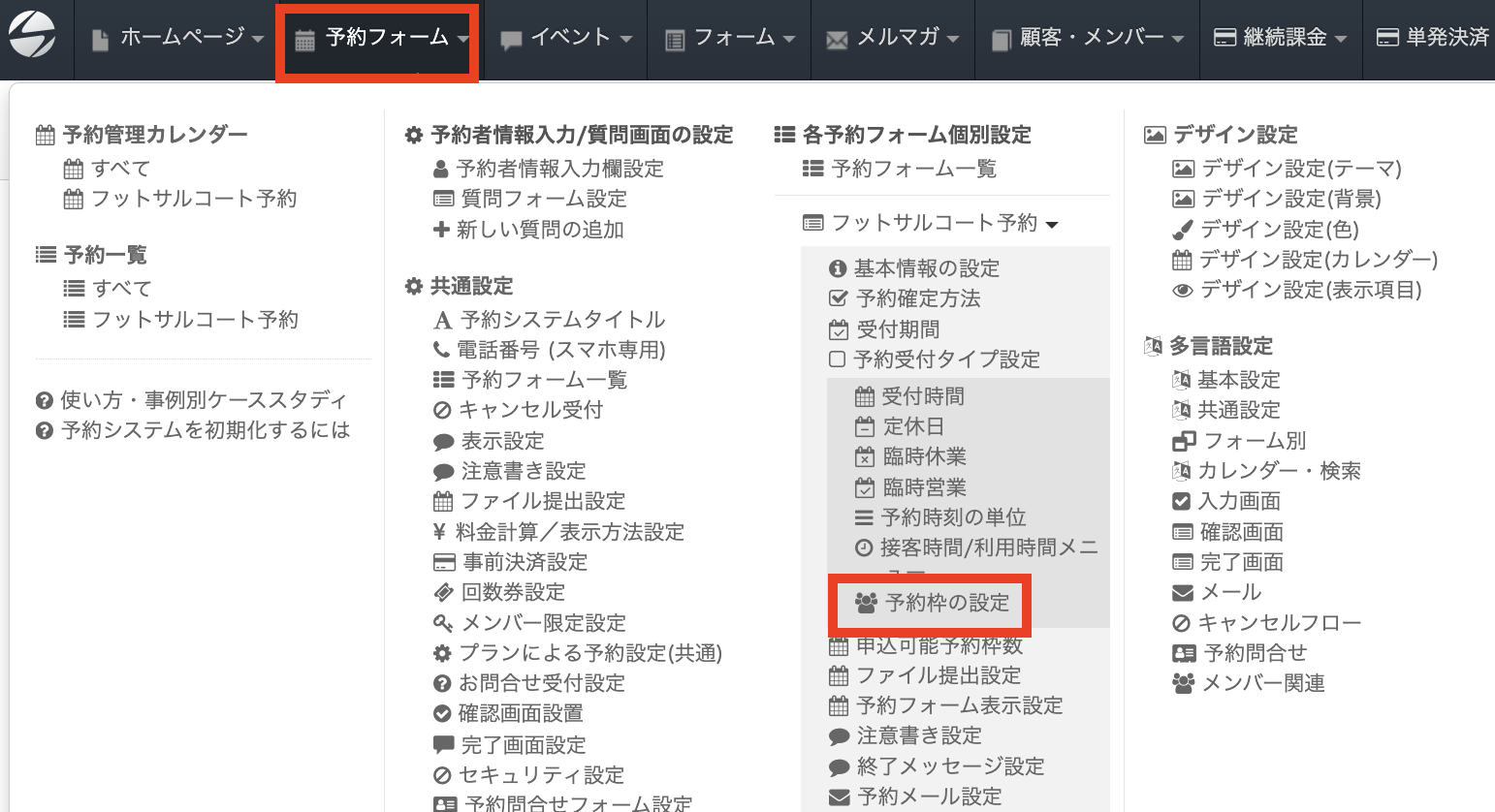 ヘッダーの「予約フォーム」をクリックすると表示される「予約枠の設定」をクリックします。