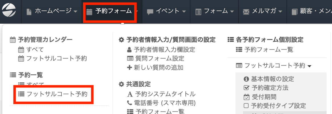 メモを登録する際は、ヘッダーの「予約フォーム」をクリックし、「フットサルコート予約」をクリックします。