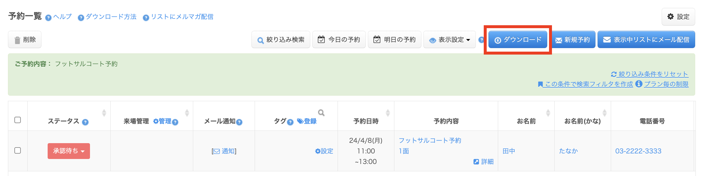 「ダウンロード」をクリックすると、絞り込んだ状態の予約リストをCSVファイルでダウンロードできます。