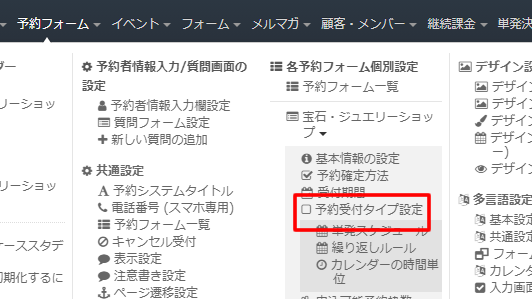 上部メニュー「予約フォーム」→「各予約フォーム個別設定/フォームタイトル/予約受付タイプ設定」をクリックします。