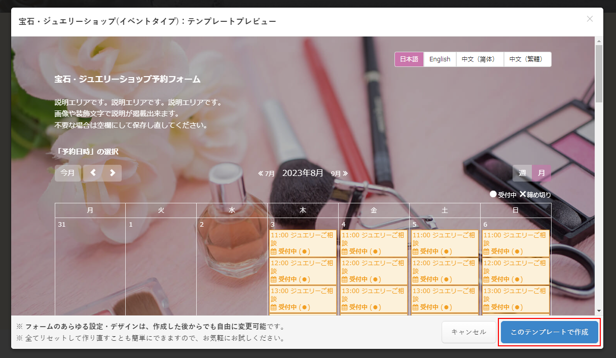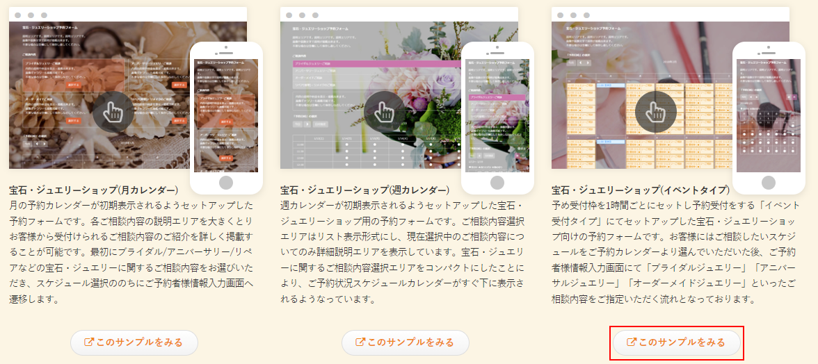 この記事でご紹介する宝石・ジュエリーショップ予約のテンプレートは「宝石・ジュエリーショップ(イベントタイプ)」のテンプレートになります。