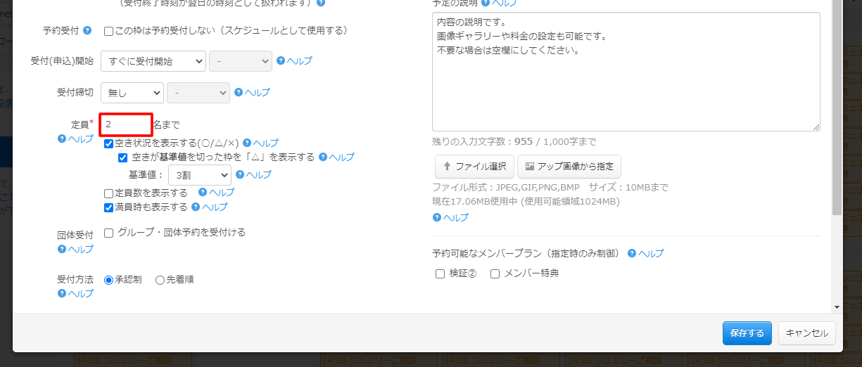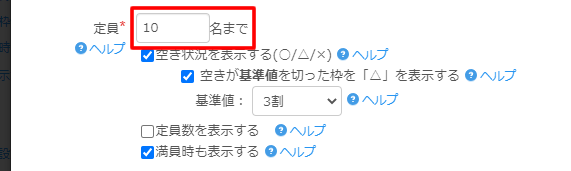 定員の設定は必須です。受け入れ可能な人数を設定します。定員数いっぱいに予約が入ると自動で締め切ります。