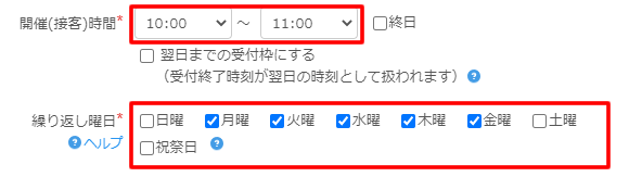 繰り返しルールの場合は、日程登録を「開催時間」「繰り返し曜日」指定して定期的な受付ルールを設定します。