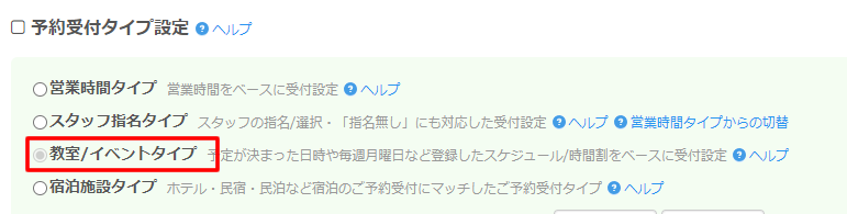 予約受付タイプ設定が表示されますので、「教室/イベントタイプ」をクリックします。