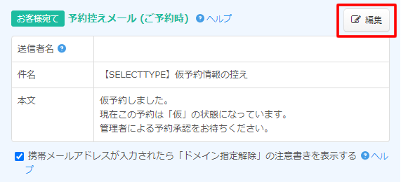 「予約控えメール (お客様宛/ご予約時)」の「編集」ボタンをクリックして設定フォームを表示します。