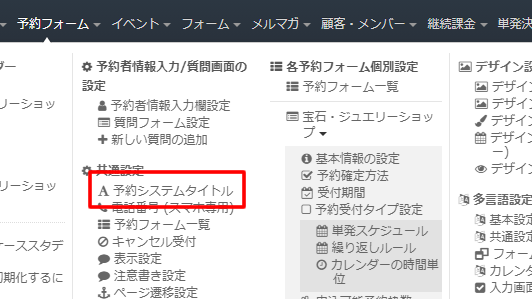 タイトルの設定は上部メニューの「予約フォーム」→「共通設定/予約システムタイトル」をクリックして移動します。