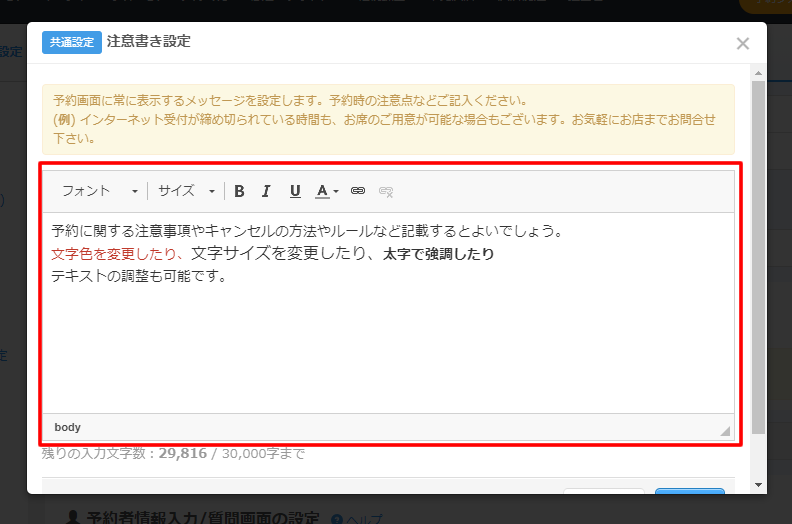 注意書き設定には上部メニューの「予約フォーム」→「共通設定/注意書き設定」をクリックして移動出来ます。