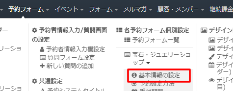 ギャラリー画像の設定は上部ヘッダーより「予約フォーム」→ “各予約フォーム個別設定“より目的の予約フォームの「基本情報の設定」から移動できます。