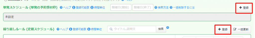 単発スケジュール・繰り返しルールの設定エリアが表示されますので、「登録」ボタンから受付枠を作成します。
