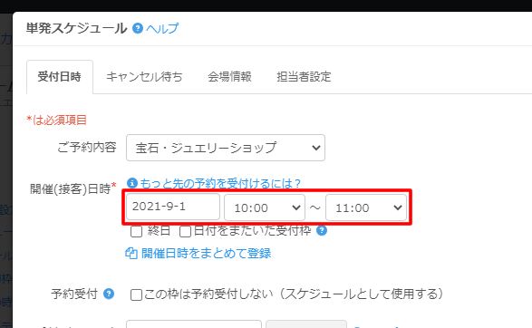 展示販売会やワークショップなど単発イベントの場合には「単発スケジュール」を使用して登録すると良いでしょう。