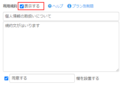 使用する場合は、利用規約の「表示する」にチェックをいれると規約文の登録フォームが表示されます。