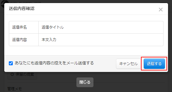 「あなたにも返信内容の控えをメール送信する」にチェックを入れて送信すると管理者宛てに返信メールの控えが届きます。