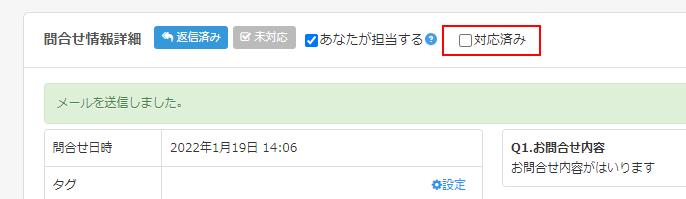 詳細画面上部の「あなたが担当する」にチェックをいれると問い合わせの担当者に設定されます。