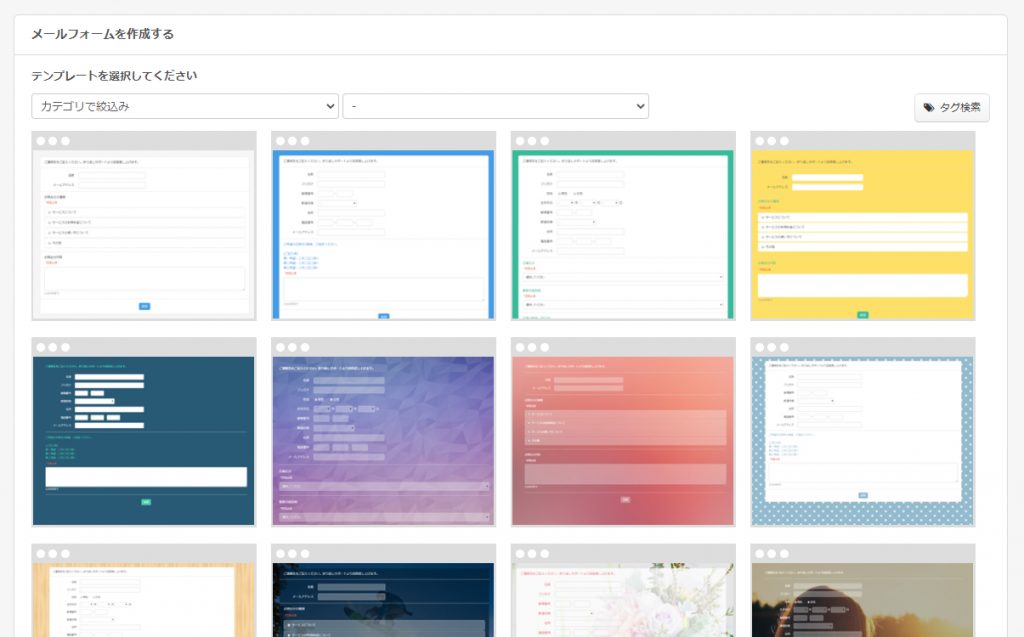 お問合せ受付の他にも、資料請求や注文フォームなどメールフォーム機能を使用して作成できるフォームのテンプレートが用意されています。