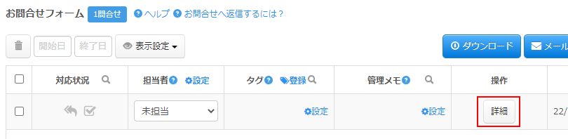 問合せ一覧から該当の問合せ情報の「詳細」をクリックします。