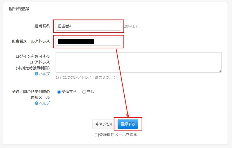 担当者登録画面にて担当者名、担当者のメールアドレス「登録する」ボタンをクリックします。