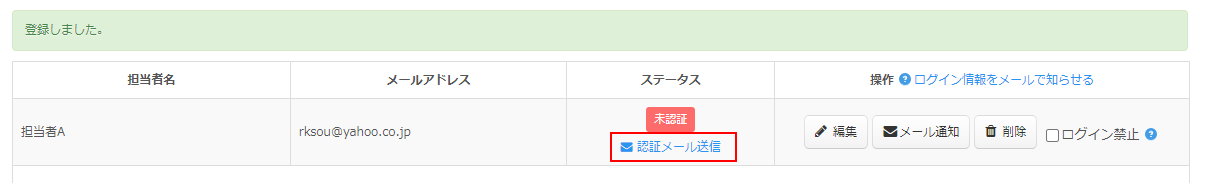 ステータスが「未認証」の状態になりますので認証(パスワード設定)を行って頂くようにしましょう。