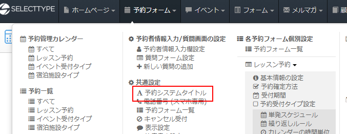 ログインしたらページ上部「予約フォーム」→”共通設定”の「予約システムタイトル」をクリックします。