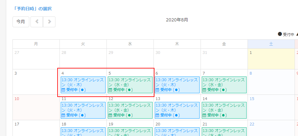 受付枠の色も設定ができますので、ここではレッスン毎に受付枠の色を変更してみます。