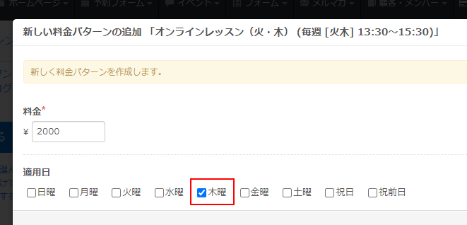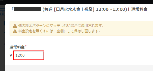 作成した繰り返しルール枠の基本となる料金です。作成した繰り返しルール枠の全日程で同じ料金にしたい場合は通常料金のみ設定をします。