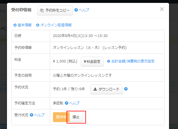 急遽ある時間帯の受付を停止しなければいけない場合には受付停止/再開機能を使うと便利です。