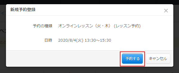 代行登録する対象の日時などが間違っていないか確認し「予約する」ボタンをクリックします。