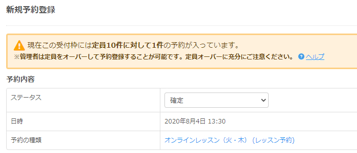 管理画面からの予約の場合、設定された定員数をこえても登録は出来る仕様になっています。