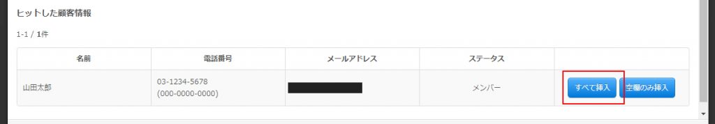 特定した情報の「すべて挿入」ボタンをクリックしますと、顧客リストに登録されている情報が登録フォームに挿入されます。